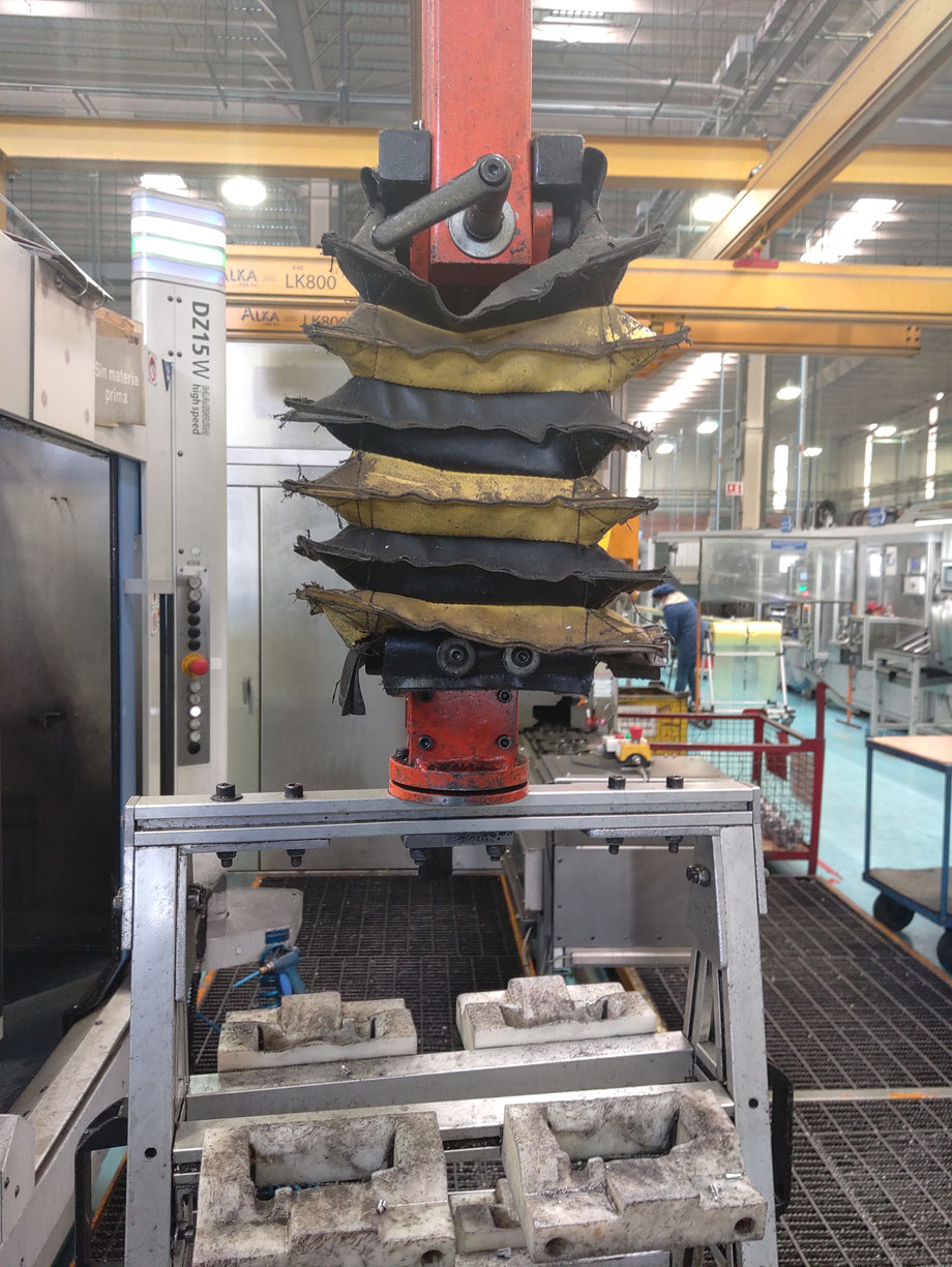 Guarda tipo acordeón para mesa elevadora, fabricado a la medida con lona retardante al fuego de PVC en color amarillo y negro.