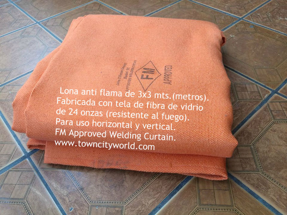 Lona anti flama de tela de fibra de vidrio de 24 onzas, (resistente al fuego), para uso horizontal y vertical, aprobada por FM, (FM Approved Welding Curtain). Soporta la escoria de metales fundidos, salpicadura y chispa de soldadura. Fabricada con bastilla y ojillos, para su fácil colocación.
