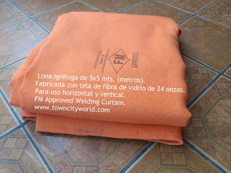 Lona ignifuga de tela de fibra de vidrio de 24 onzas, (resistente al fuego), para uso horizontal y vertical, aprobada por FM, (FM Approved Welding Curtain). Soporta la escoria de metales fundidos, salpicadura y chispa de soldadura. Fabricada con bastilla y ojillos, para su fácil colocación.