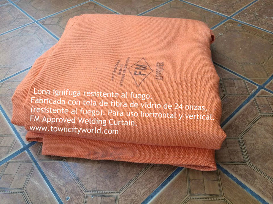 Lona ignífuga de tela de fibra de vidrio de 24 onzas, (resistente al fuego), para uso horizontal y vertical, aprobada por FM, (FM Approved Welding Curtain). Soporta la escoria de metales fundidos, salpicadura y chispa de soldadura. Fabricada a la medida, con bastilla y ojillos, para su fácil colocación.